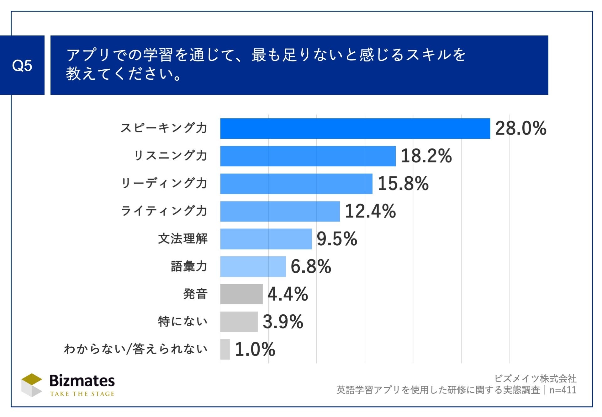 「Q5.アプリでの学習を通じて、最も足りないと感じるスキルを教えてください。」(n=411)と質問したところ、「スピーキング力」が28.0%、「リスニング力」が18.2%、「リーディング力」が15.8%という回答となりました。
