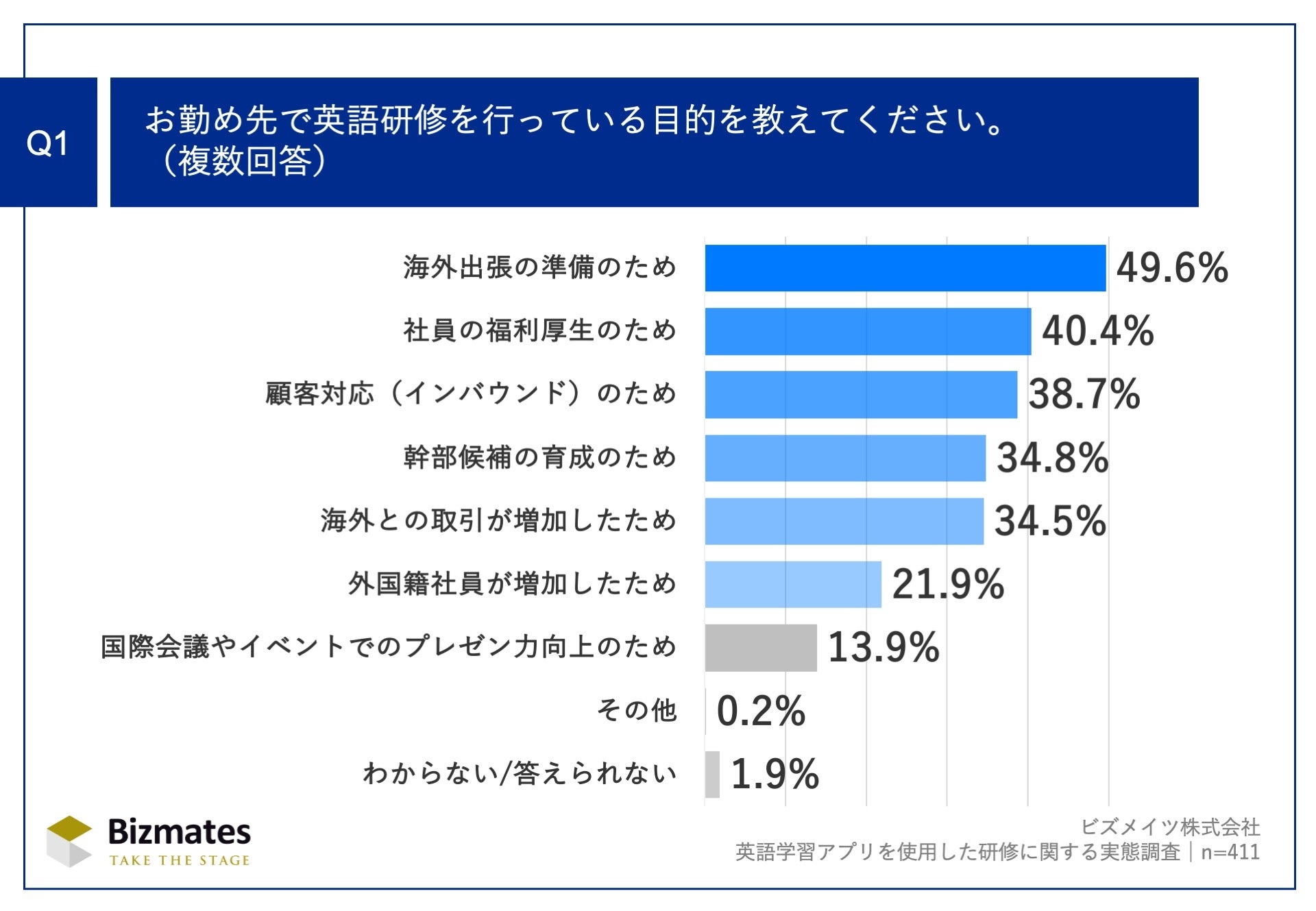 「Q1.お勤め先で英語研修を行っている目的を教えてください。(複数回答)」(n=411)と質問したところ、「海外出張の準備のため」が49.6%、「社員の福利厚生のため」が40.4%、「顧客対応(インバウンド)のため」が38.7%という回答となりました。