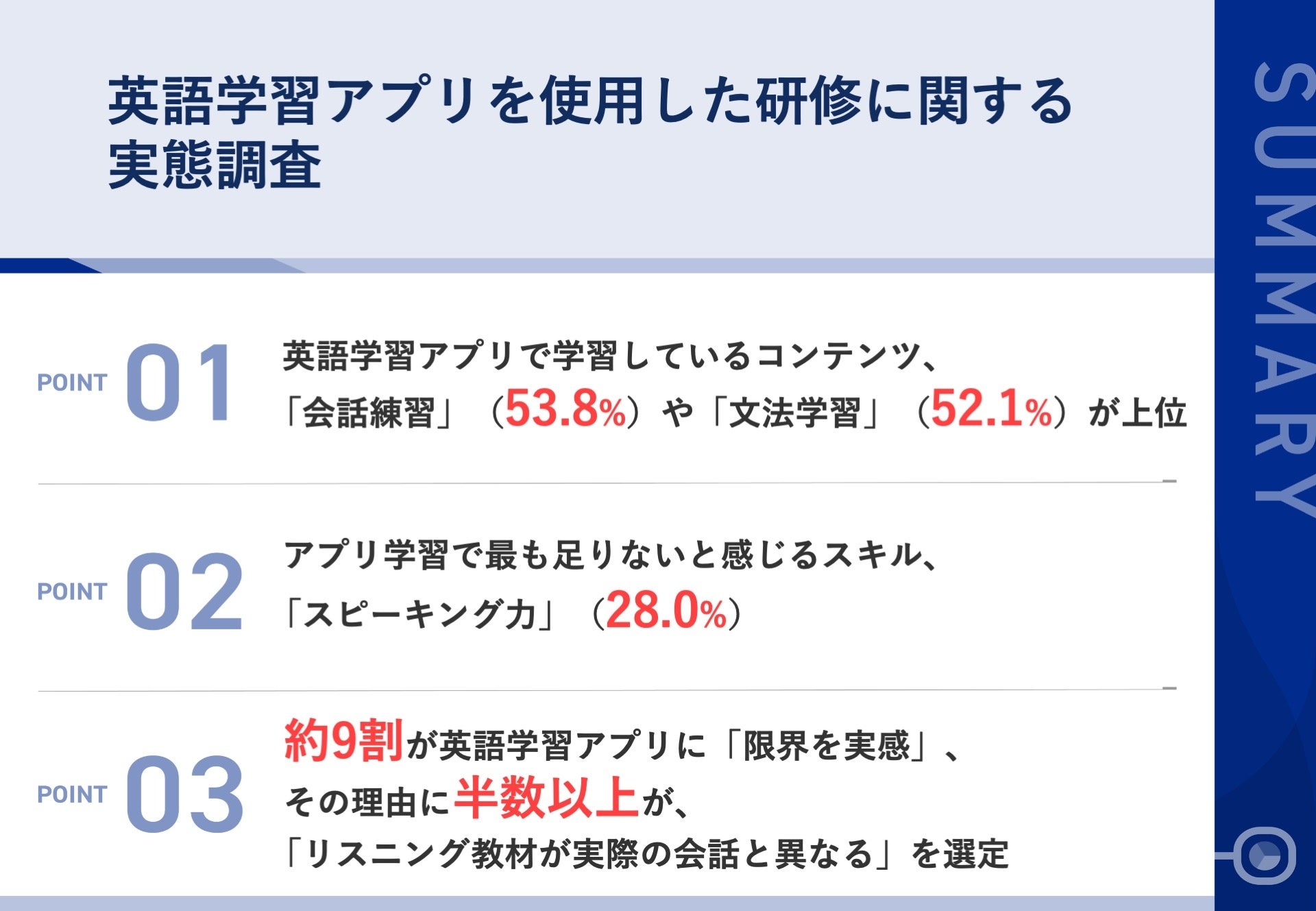 【英語学習アプリを使用した研修に関する実態調査】英語学習アプリだけでの学習に約9割が限界を感じている