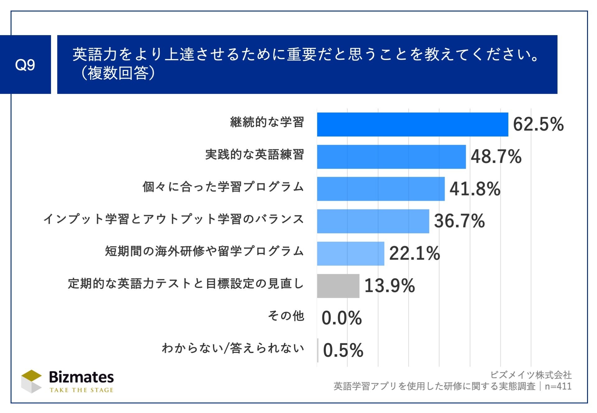 「Q9.英語力をより上達させるために重要だと思うことを教えてください。(複数回答)」(n=411)と質問したところ、「継続的な学習」が62.5%、「実践的な英語練習」が48.7%、「個々に合った学習プログラム」が41.8%という回答となりました。