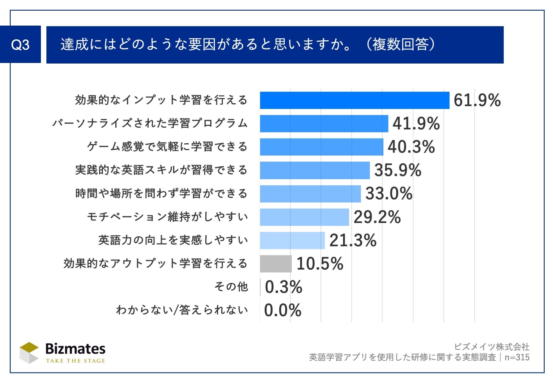Q2で「かなり達成できている」「やや達成できている」と回答した方に、「Q3.達成にはどのような要因があると思いますか。(複数回答)」(n=315)と質問したところ、「効果的なインプット学習を行える」が61.9%、「パーソナライズされた学習プログラム」が41.9%、「ゲーム感覚で気軽に学習できる」が40.3%という回答となりました。