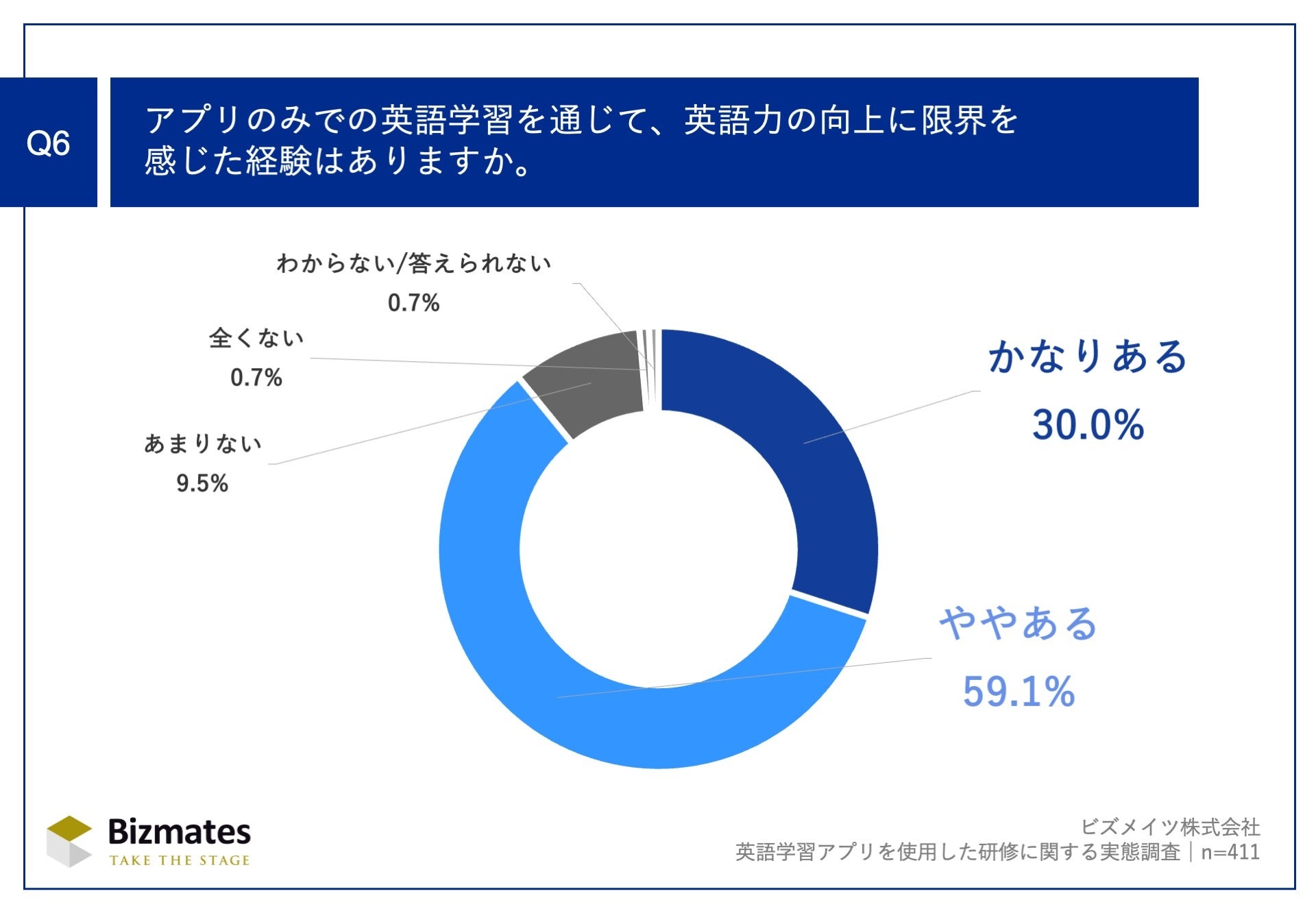 「Q6.アプリのみでの英語学習を通じて、英語力の向上に限界を感じた経験はありますか。」(n=411)と質問したところ、「かなりある」が30.0%、「ややある」が59.1%という回答となりました。