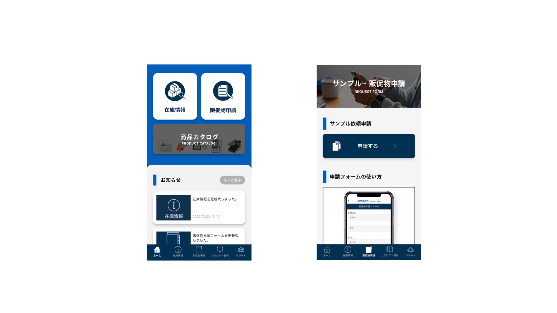 オムロンヘルスケアは血圧計や体温計などの医療機器およびサービスの開発・製造・販売を行う企業です。同社は、代理店を経由して家電量販店やドラッグストアなどに商品を提供しており、代理店担当者との商品や販促資材の在庫確認および発注業務などの事務作業効率化の要望がありました。