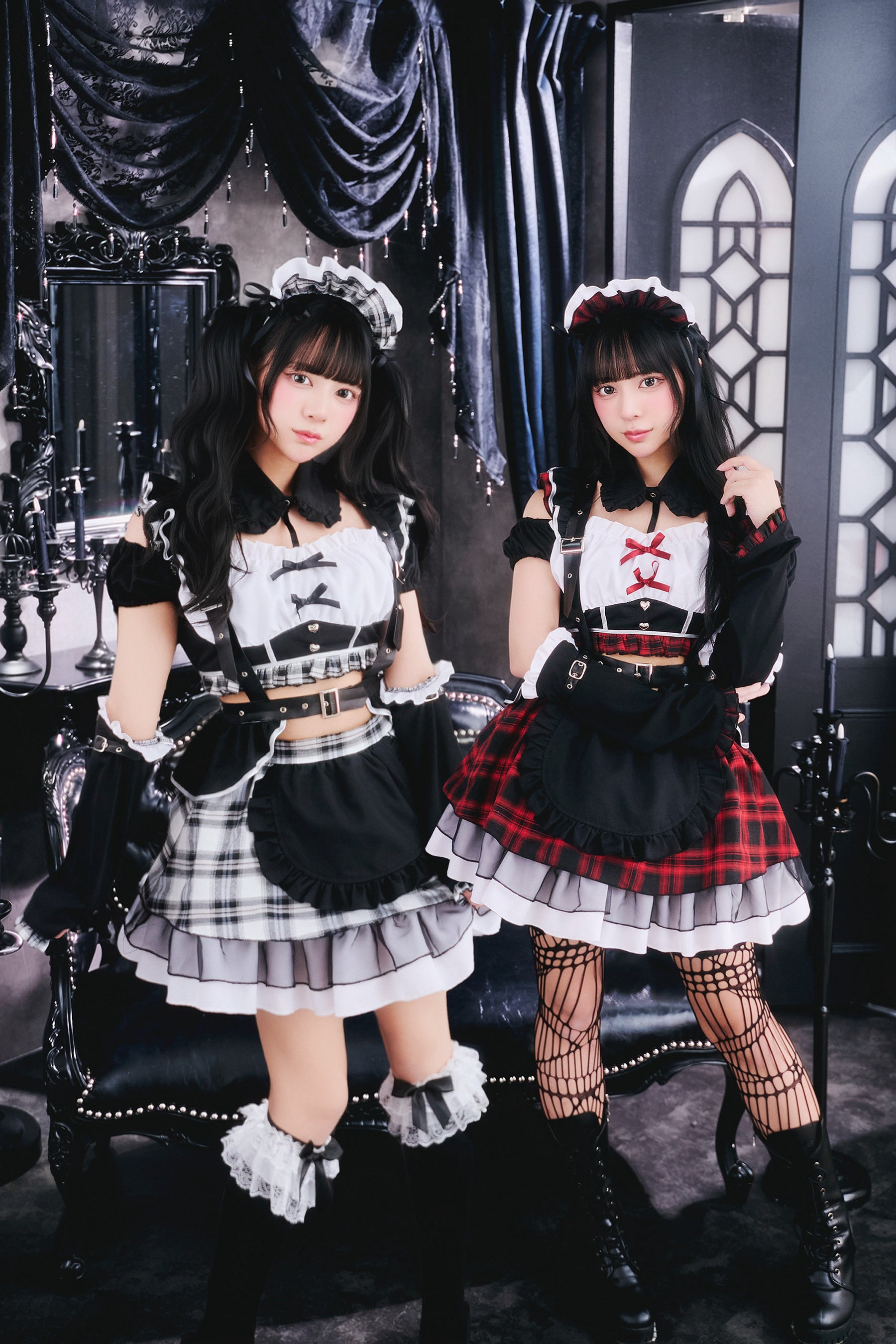 ブラックを基調に、モノトーンチェック/赤チェックを組み合わせたロックテイスト漂うメイドコスチューム。ハーネス付きベルトやアームカバーをセットにすることで、メイドスタイルに程よいハード感をプラスし、シリーズらしいエッジの効いた印象を演出しました。