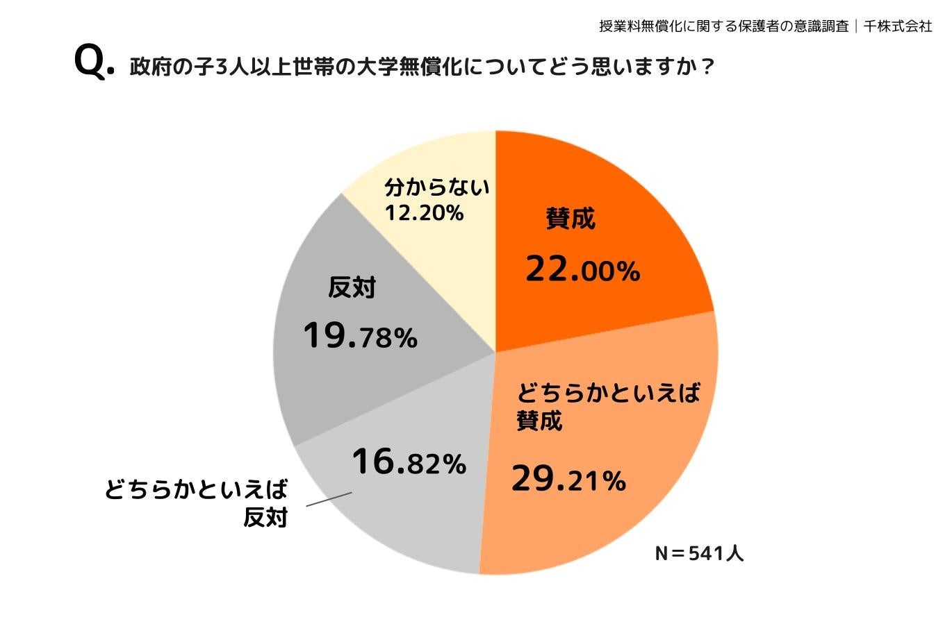 政府の子3人以上世帯の大学無償化についてどう思うか質問したところ、「賛成」(22.00%)、「どちらかといえば賛成」(29.21%)、合わせて51.21%で、半数は賛成寄りの考えであることが分かります。