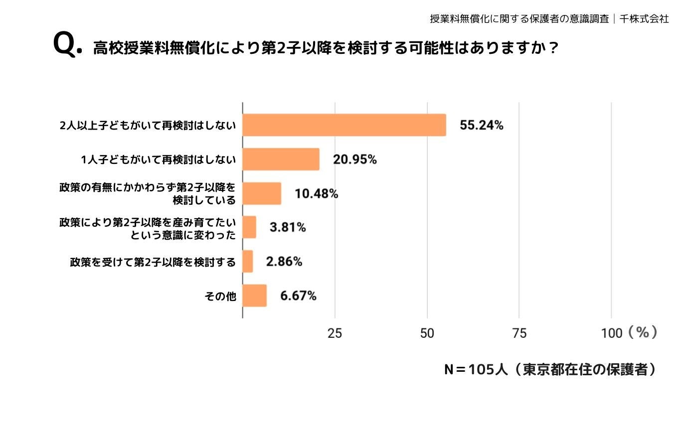 この政策により第2子以降を検討する可能性があるか質問したところ、「2人以上子どもがいて再検討はしない」(55.24%)、「1人子どもがいて再検討はしない」(20.95%)で、再検討しないと答えた保護者が76.19%。「政策により第2子以降を産み育てたいという意識に変わった」(3.81%)、「政策により第2子以降を検討する」(2.86%)合わせて6.67%で、この政策により更に子どもを産みたいという意識の変化があった保護者は多くないことが分かります。