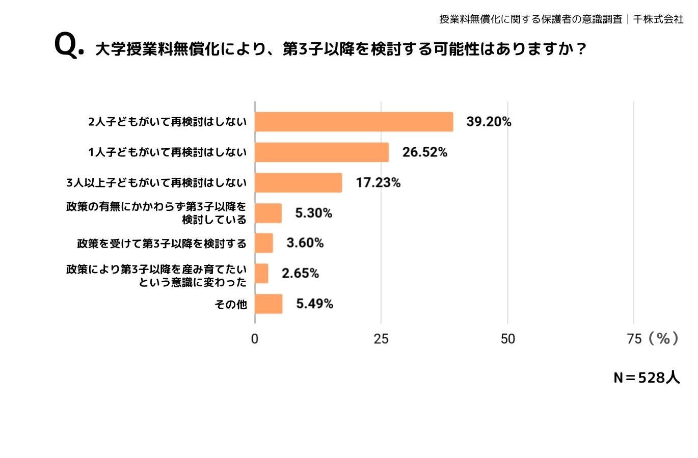 さらに、この政策により第2子、第3子以降を検討する可能性があるか質問したところ、東京都の高校授業料無償化については「政策を受けて第2子以降を検討する」(2.86%)、政府の多子世帯の大学無償化については「政策を受けて第3子以降を検討する」(3.60%)で、いずれも、この政策により更に子どもを産みたいという意識の変化があった保護者は僅かであることが分かります。