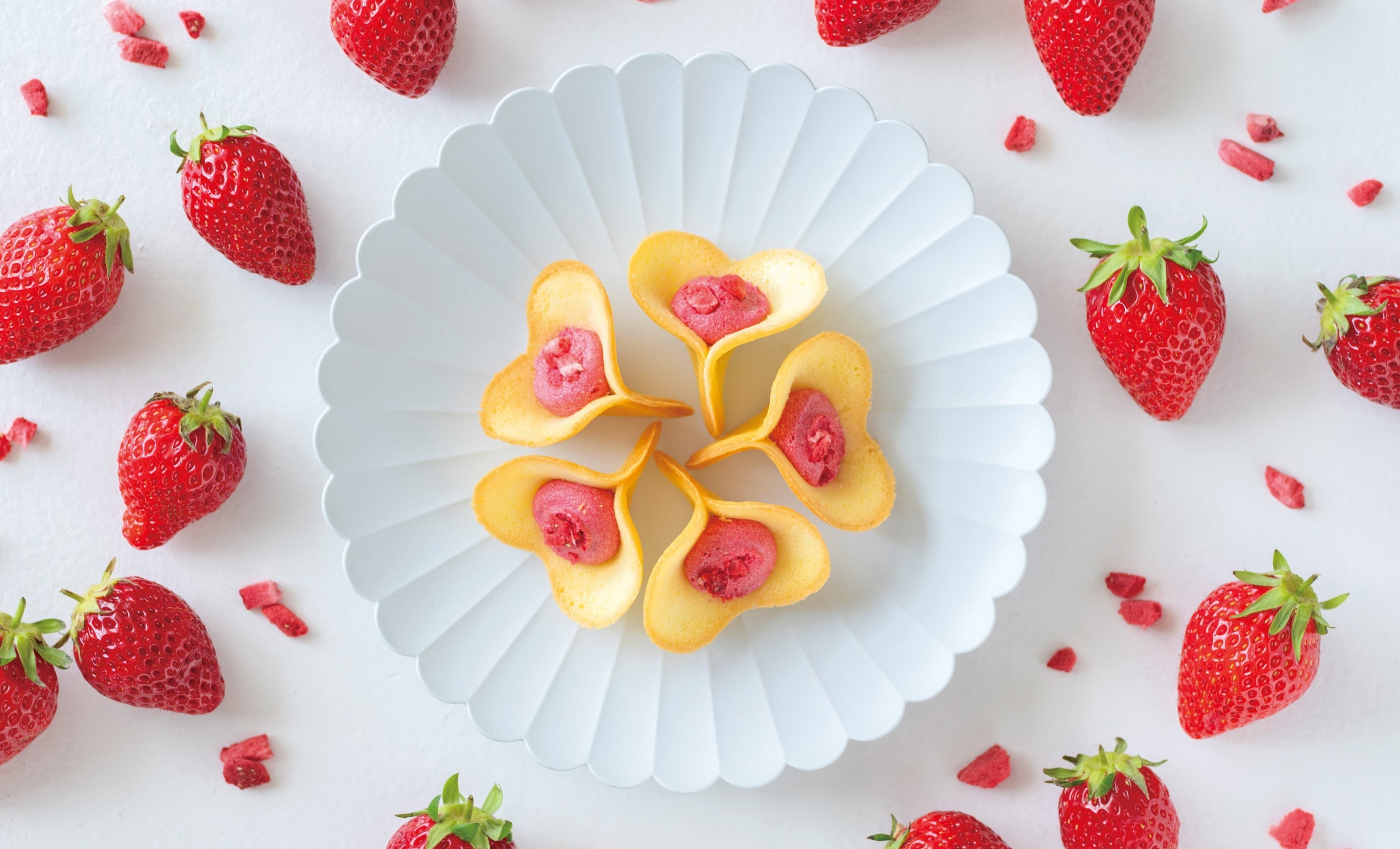 クリームにあしらった苺のフリーズドライが、甘酸っぱい風味を さらに引き立てます。