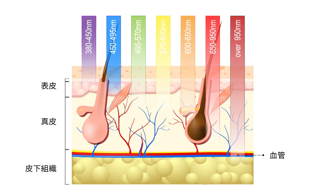 肌に有害な紫外線を含まないため、美容クリニックや美顔器などにも使用されるLEDライト。紫から赤まで色によって到達深度が異なるため、期待できる効果も変わります。