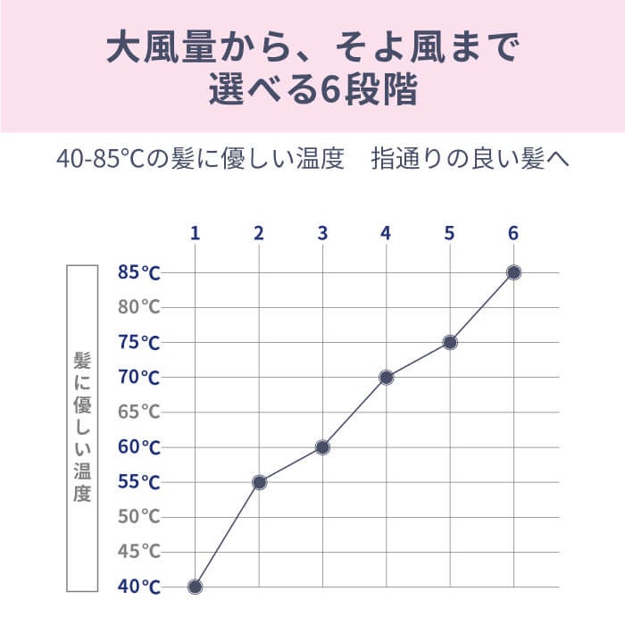 濡れた髪を乾かすときは大風量、毛先などを内巻きにしたい、寝癖をリセットしたいときは弱風、仕上げのツヤ出しは冷風と、ドライヤーはただ風を当てるだけではなく、風量&温度調節をすることでダメージを抑えたり、スタイリングしやすくなります。
