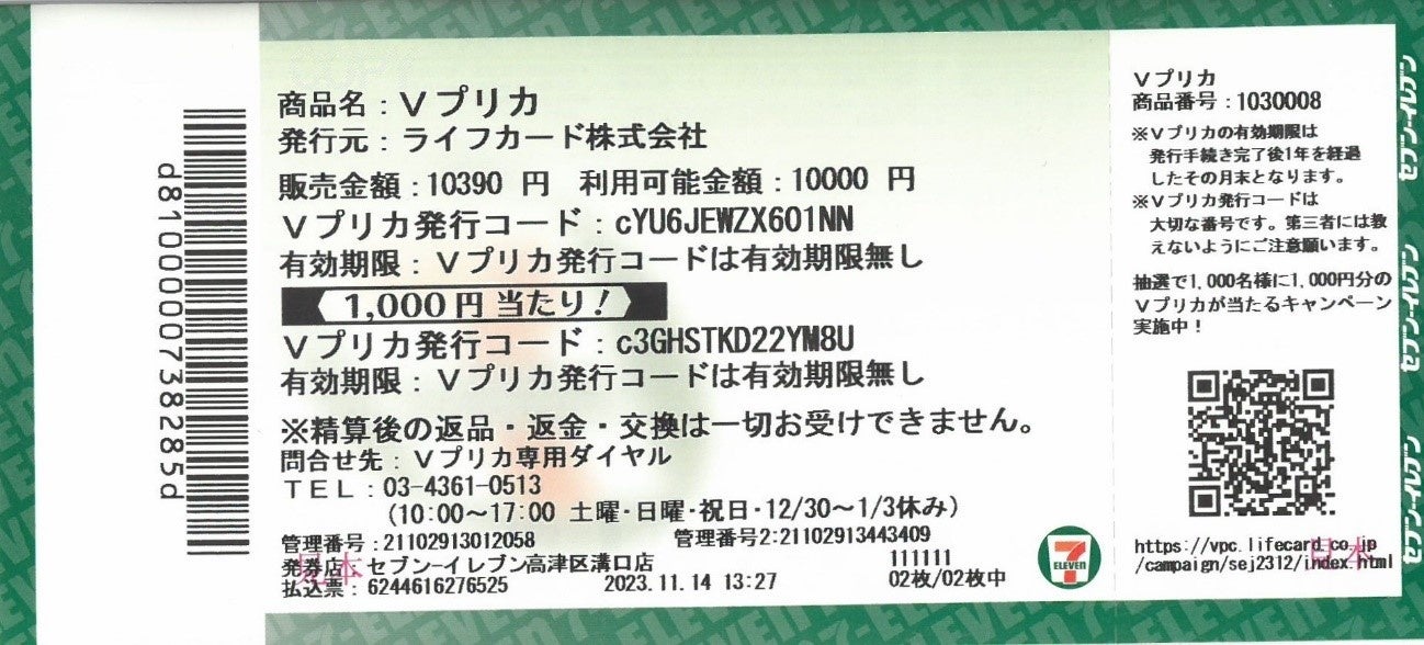 Vプリカ購入後、レジで受け取るチケットに【1,000円当たり!】の記載があれば当たりです。