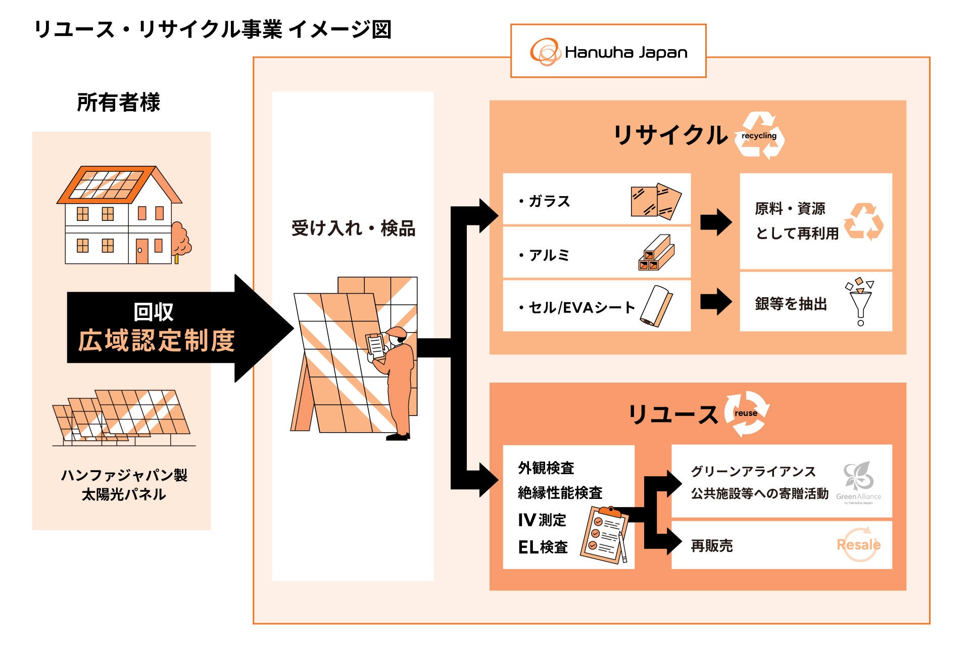 このたびの太陽光パネルのリユース・リサイクル事業は、太陽光パネルメーカーの広域認定制度※³を活用し、ハンファジャパン製の使用済み太陽光パネルの回収から適正処理までを一貫して行うサービスを提供予定です。本制度に基づきメーカーが一括で取りまとめることで、ご購入者の皆様は個別に収集業者やリサイクル業者を探す手間が省け、不法投棄などのリスクを回避し、安心して回収処分をお任せいただけます。また、全国的なネットワークを構築することにより、効率的な回収・処理体制を実現し、コスト削減にも繋がります。
