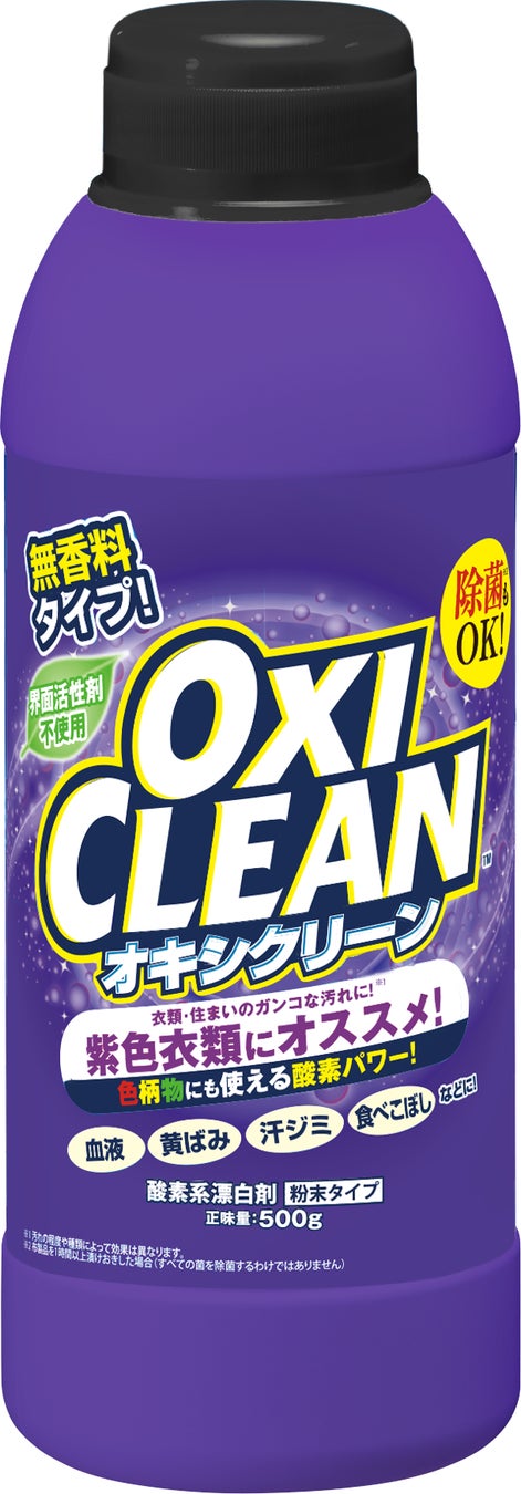 オキシクリーンPOWERFUL Purple 500gは、蛍光増紫剤をプラスした漂白剤です。紫色衣類を除菌・消臭・漂白しながら、より鮮やかな紫色に仕上げます。紫色素に反応し、紫色衣類のみに効果を発揮する特殊成分を使用しており、紫色以外の衣類と一緒にお使いいただけます。本商品を使用した衣類を着ることで、力強さと上品さ・癒しといった印象を与えることができます(※2)。