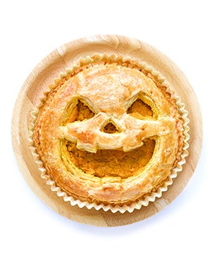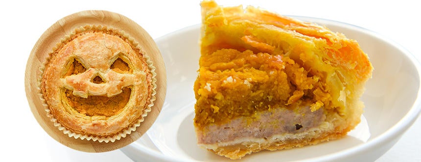 たっぷりとした肉の上にカボチャをぎっしりと詰めた、食べ応え抜群なミートパイです。ハロウィンらしいジャック・オ・ランタンの顔が特徴的な季節のデリです。(原材料名:合挽肉、カボチャ、無塩バター、強力粉、薄力粉、鶏卵、原産国名:日本、サイズ:直径約11.5cm×高さ3.5cm、内容量:210g、価格:1,760円(税込み))