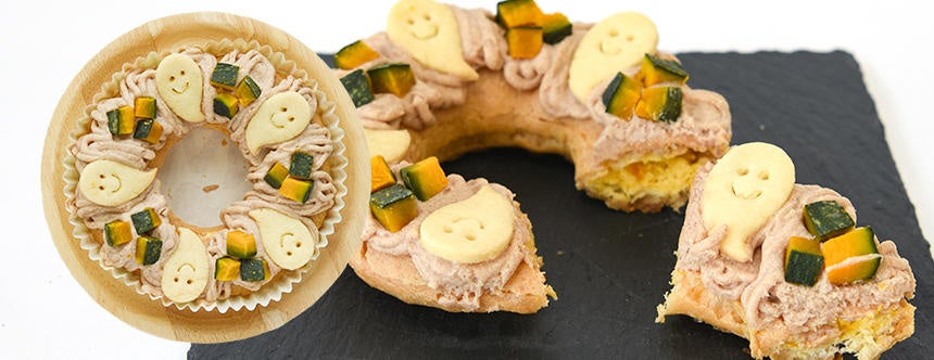かわいらしいおばけのクッキーを飾り付けたリングシューです。中にはパンプキンクリームを入れて、上にはマロンクリームとカボチャのダブルで秋の味覚を感じられます。プレゼントにもおすすめです。(原材料名:低脂肪生クリーム、カボチャ、マロンペースト、鶏卵、薄力粉、無塩バター、グラニュー糖、原産国名:日本、サイズ:直径約11.5cm×高さ3.5cm、内容量:100g、価格:1,760円(税込み))