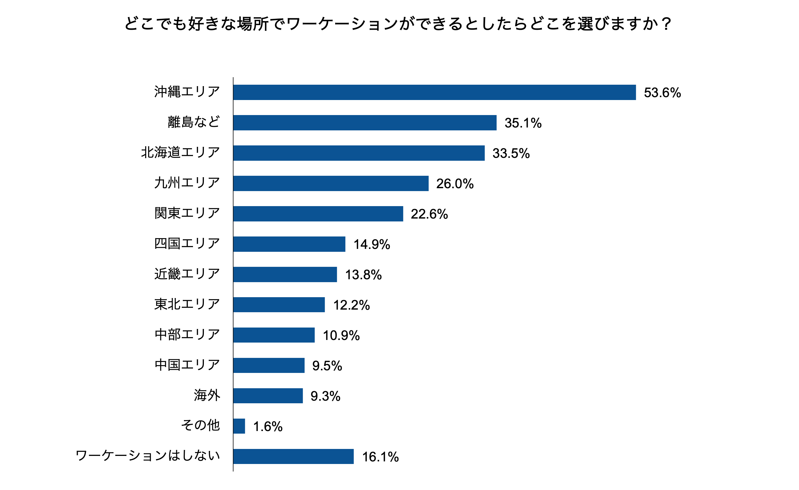 また、「好きな場所でワーケーションができるとしたらどこを選びますか?(※予算が十分あると仮定)」という質問に対する、16.1%が「ワーケーションはしない」という回答(図表5)から、旅行は好きだが、旅行先でまで仕事をしたくないという人も少なくないのではないかと思います。「リモートワーク=リゾートで悠々自適に仕事をする」などのイメージと現実は違いそうです。