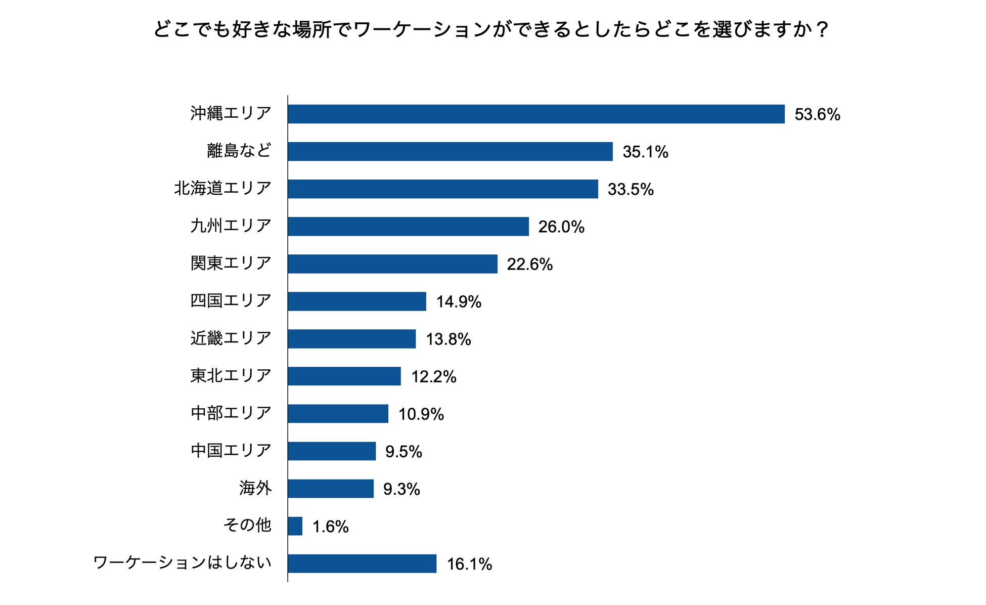 また、「好きな場所でワーケーションができるとしたらどこを選びますか?(※予算が十分あると仮定)」という質問に対する、16.1%が「ワーケーションはしない」という回答(図表5)から、旅行は好きだが、旅行先でまで仕事をしたくないという人も少なくないのではないかと思います。「リモートワーク=リゾートで悠々自適に仕事をする」などのイメージと現実は違いそうです。