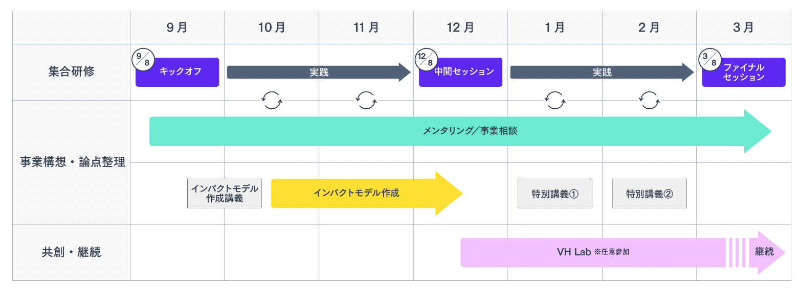 ここに集うメンバーは、お互いを尊重し、学び合い、切磋琢磨しながら6ヶ月間のプログラムを共に歩んでいきます。その関係性もまた、かけがえのない資産となることでしょう。また、プログラム終了後はVH Labに参加し、様々なセクターに属するメンバーとの協働を育むことができます。