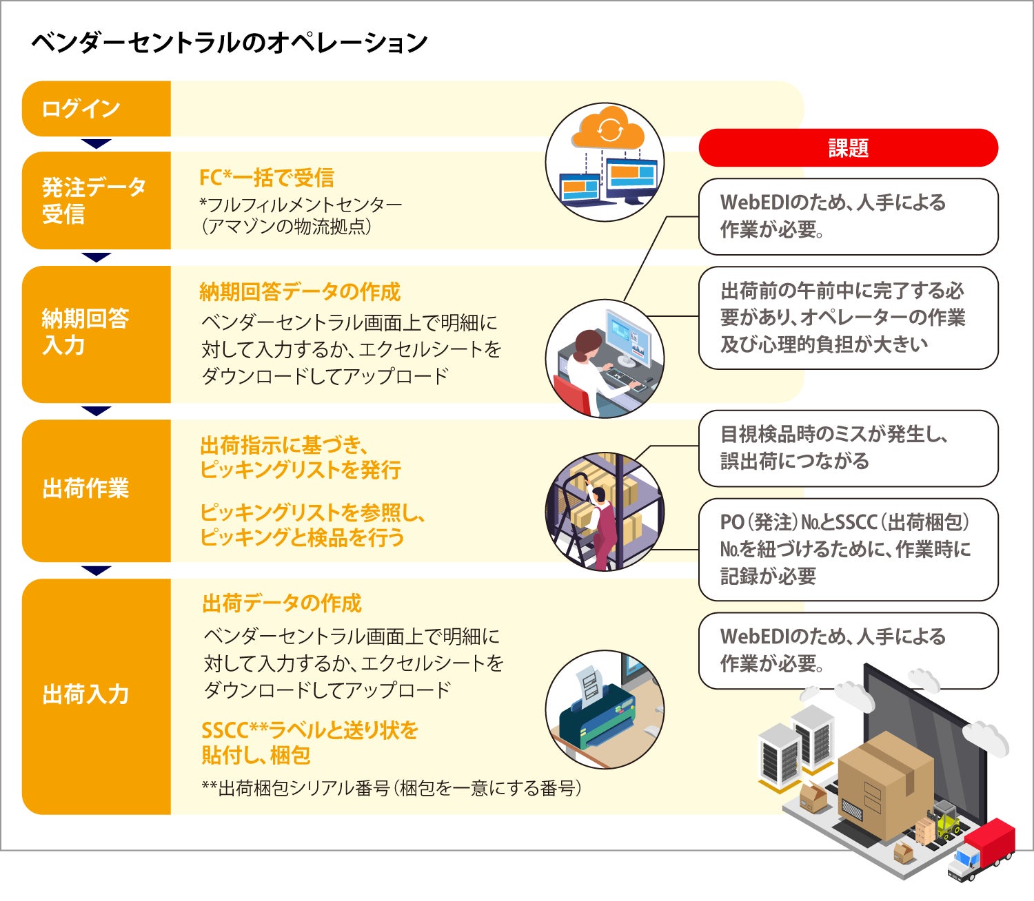 アマゾンの『ベンダーセントラル』での受注から出荷までの業務では、「人手作業による工数負担が重い」「登録ミスによる遅延がある」「残業の発生」などの課題が顕在化しています。amazingEDIはそれらの課題を解決する「カスタマイズ不要のアマゾン取引専用EDIシステム」として、好評いただいております。