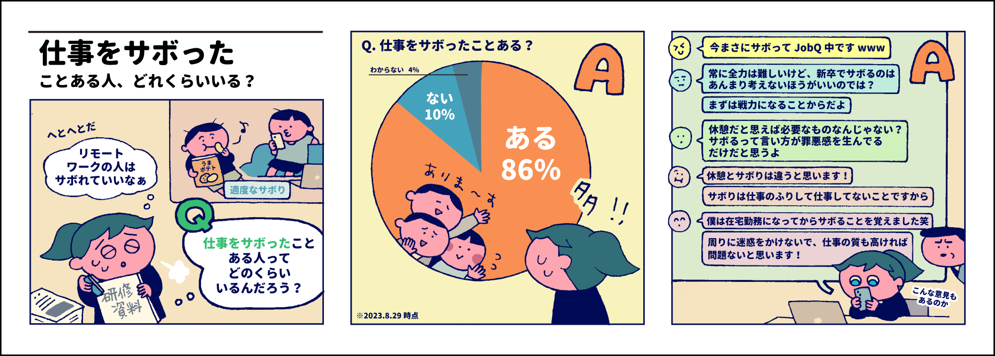 JobQ TownのQ&Aで「サボり」に関する投稿を漫画で紹介しています。