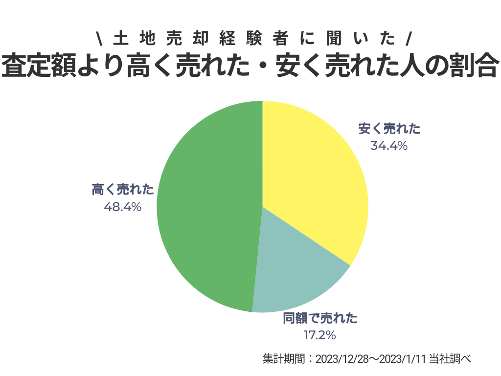 土地の売却を経験した64人(17人査定価格無回答)のうち、査定額よりも安く売れた人は22人(34.4%)、同額で売れた人は11人(17.2%)、高く売れた人は31人(48.4%)でした。