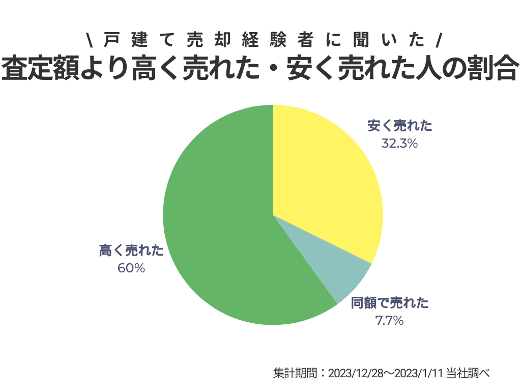 戸建ての売却を経験した65人(18人査定価格無回答)のうち、査定額よりも安く売れた人は21人(32.3%)、同額で売れた人は5人(7.7%)、高く売れた人は39人(60%)でした。
