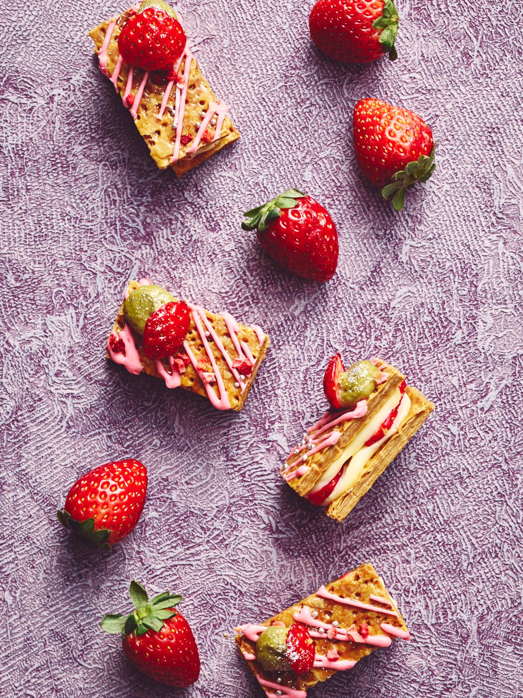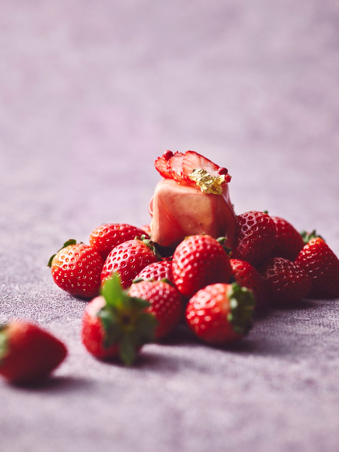サクサクのパイ生地をドレッシーにストロベリーフォンダンでグラサージュしたミルフィーユ、チーズケーキにはストロベリージュレをストールのように纏わせて可憐な美しさを、スパイスとエディブルフラワーで彩り華やかに仕上げたサーモンのたたきは、食べるのが惜しいほどフォトジェニックに。