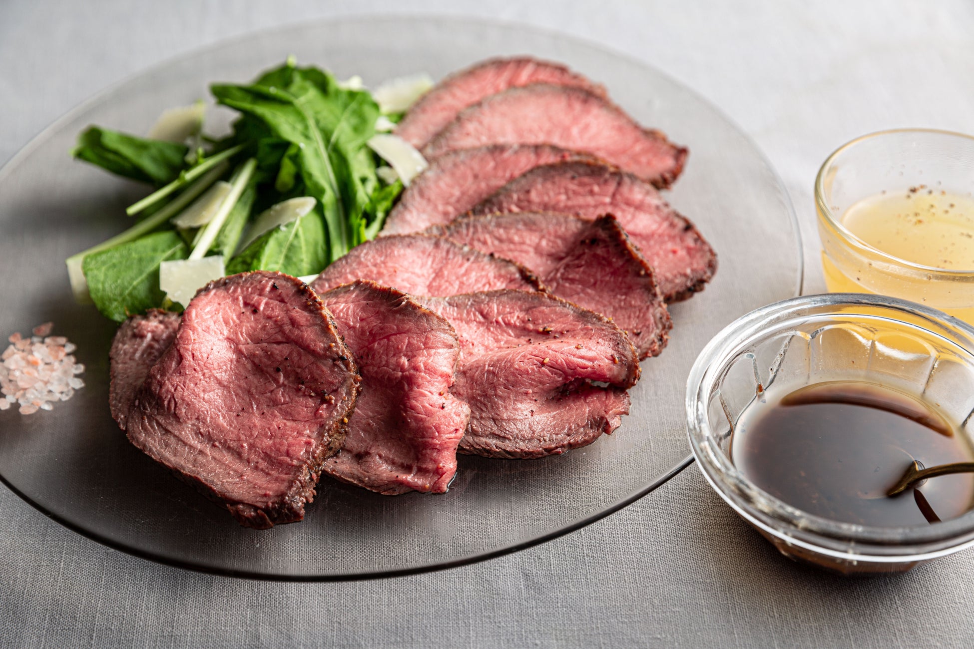 お好みでルッコラ、パルミジャーノレッジャーノを添え、岩塩やたれにつけていただく。