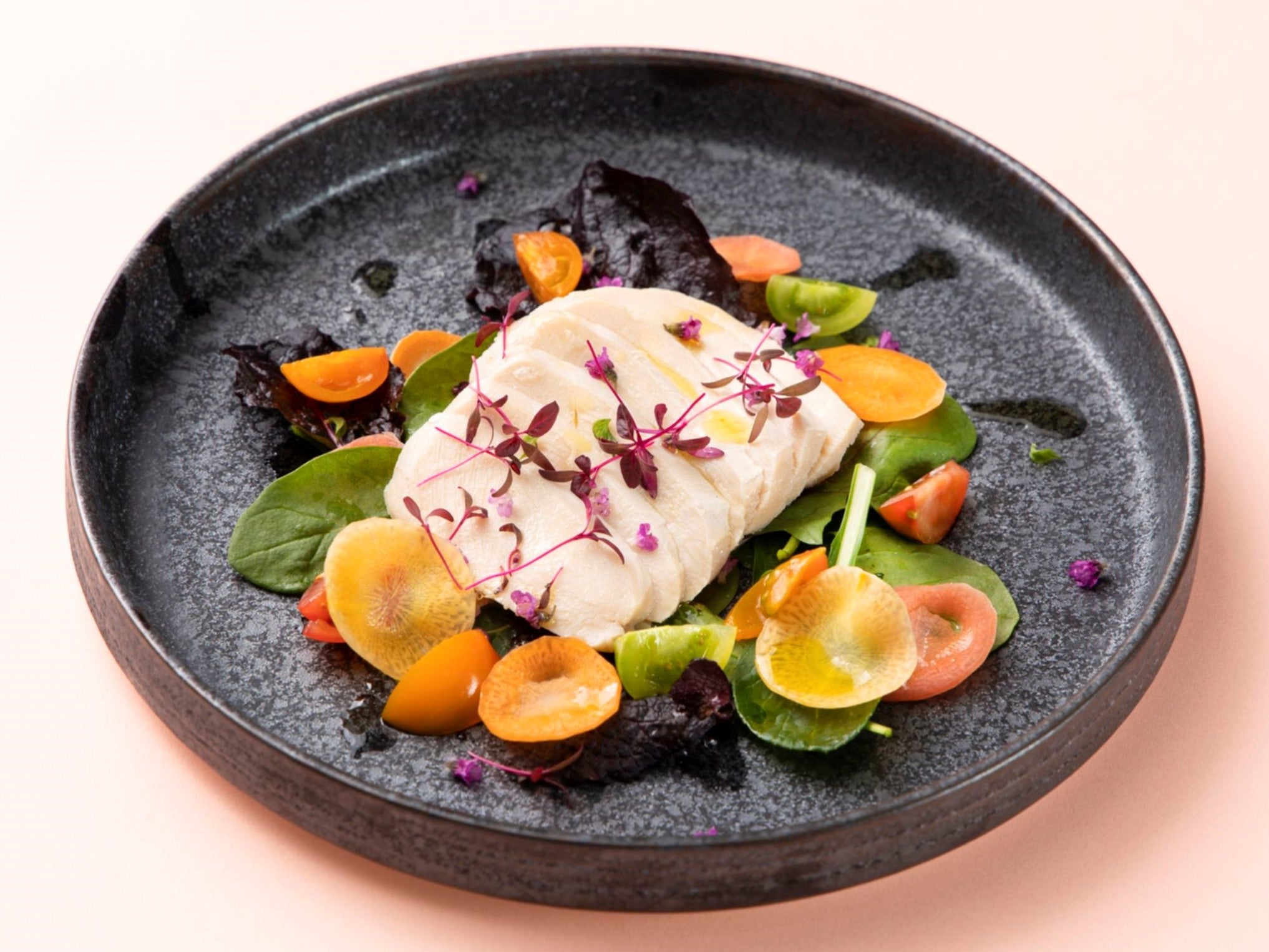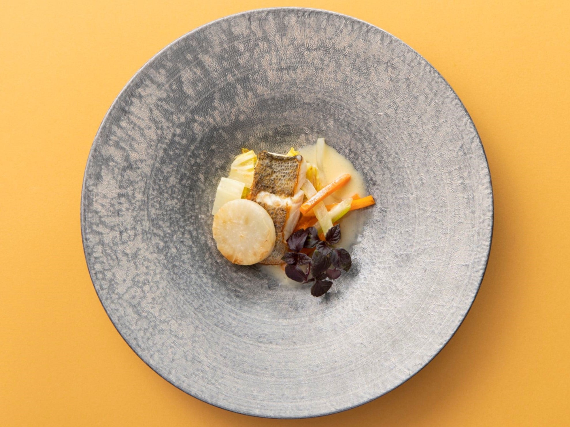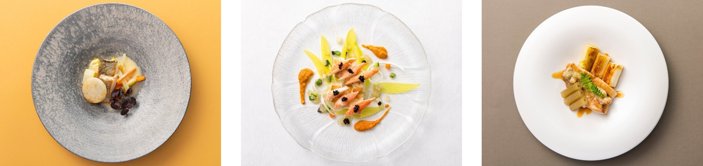 ・東京湾鱸のポワレ しんとり菜(江戸川区)と小蕪(清瀬市) ハマグリと紫芽(足立区)のナージュ(写真左)