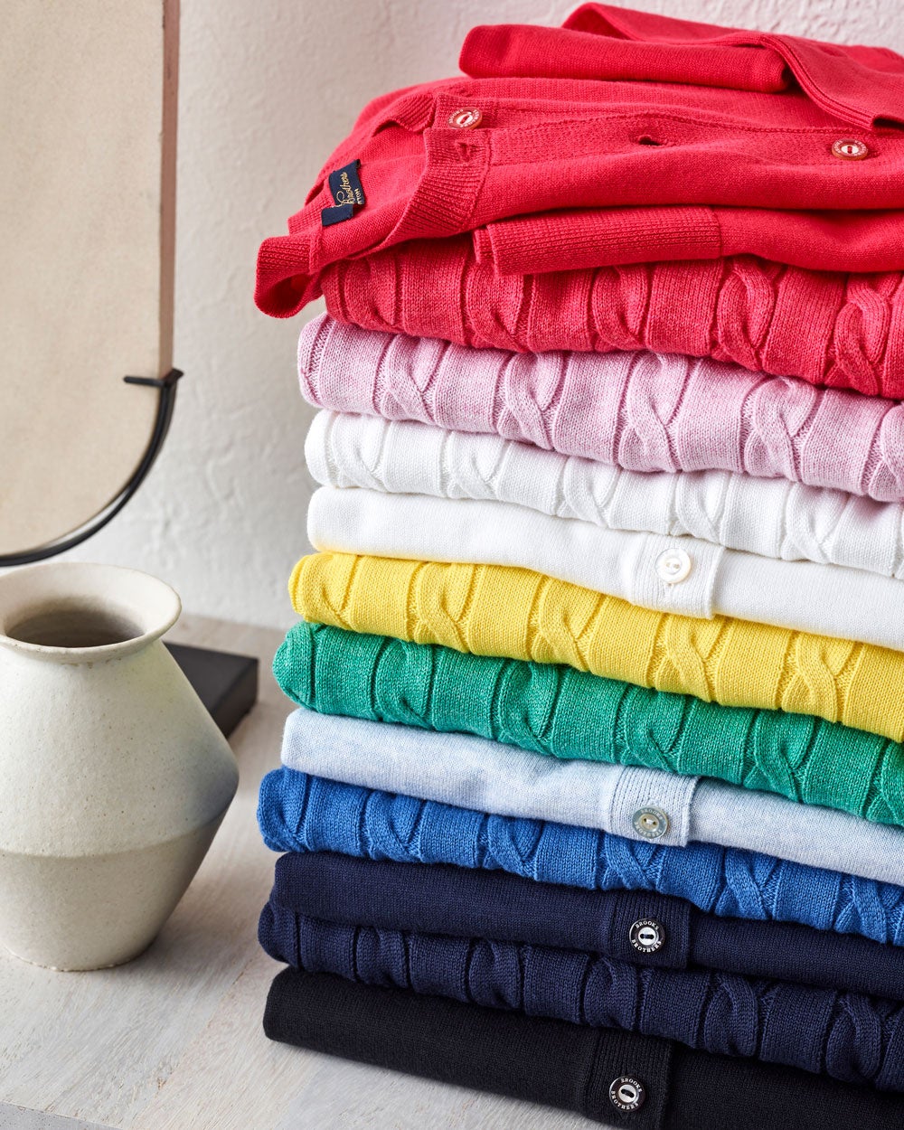上質なスーピマコットンを使用したクラシックなケーブルセーターや同素材のニットと合わせてアンサンブルにもなるカーディガンは、ベーシックな色合いから春夏のコーディネートに取り入れやすいパステルカラーを揃えています。薄手なのでジャケットやアウターのインナーにもおすすめです。