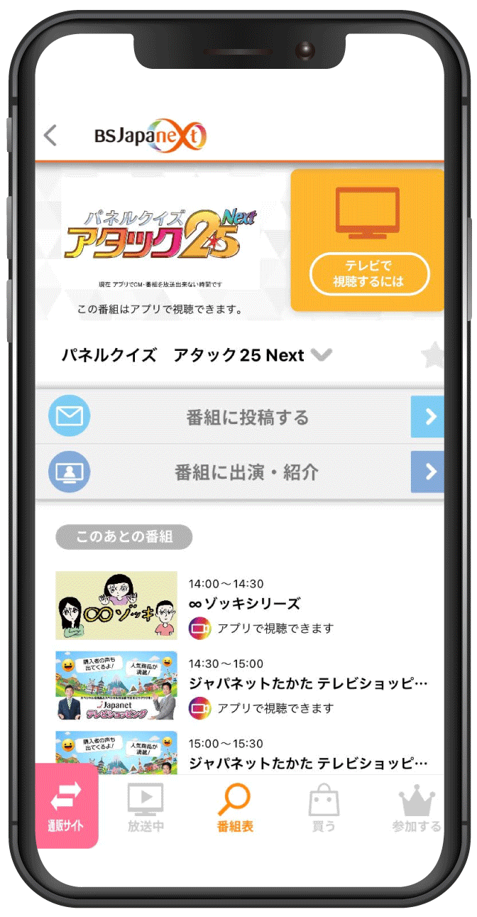 これまで当番組は、『BSJapanext(263ch)』のみでの放送でしたが、皆様からいただいたご要望にお応えし、より多くの方にお楽しみいただけるよう、公式アプリ『つながるジャパネット』でも配信することを決定いたしました。