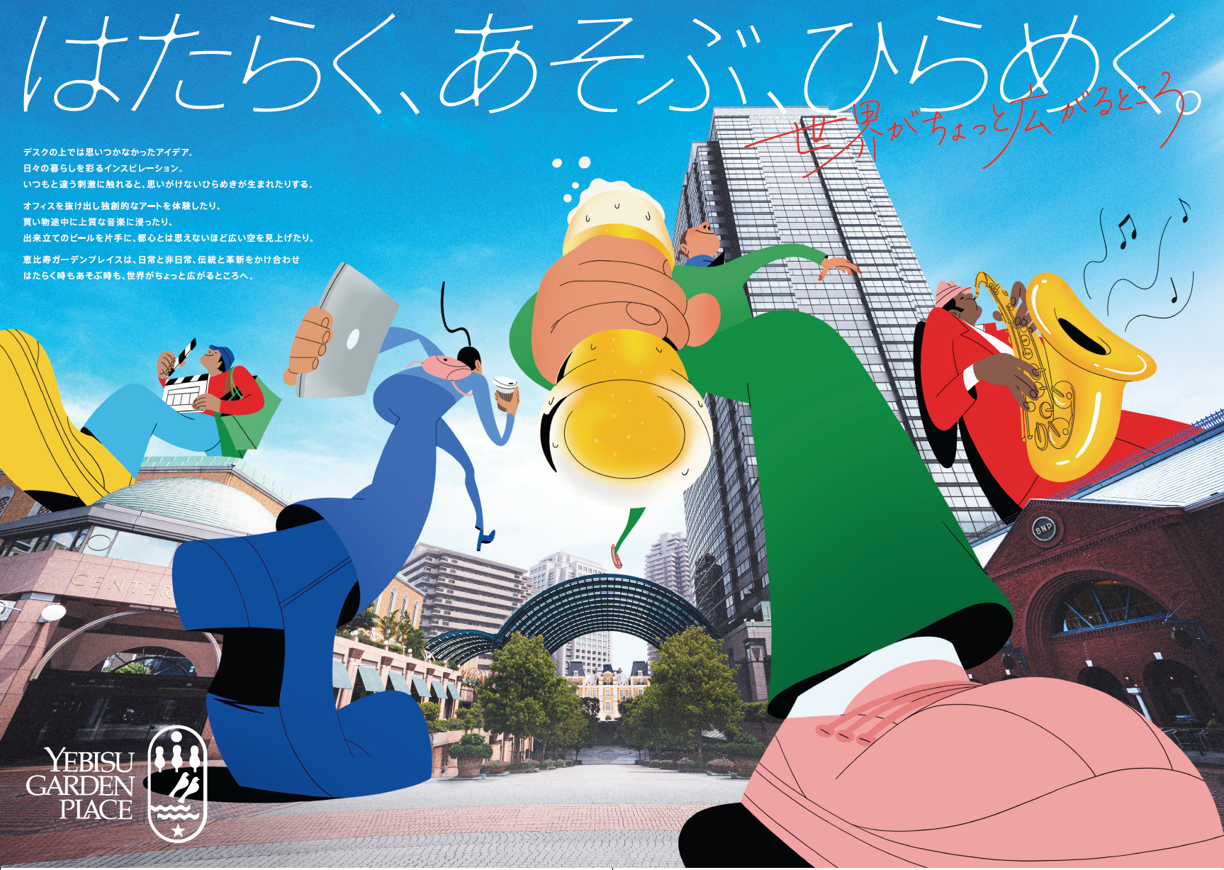 当社は、恵比寿ガーデンプレイスのコンセプトである「はたらく、あそぶ、ひらめく。」のもと、イノベーションを生み出す環境づくりを通じて新たな価値を創造し、恵比寿のまちを「ひらめきが生まれるまち」にしていきます。