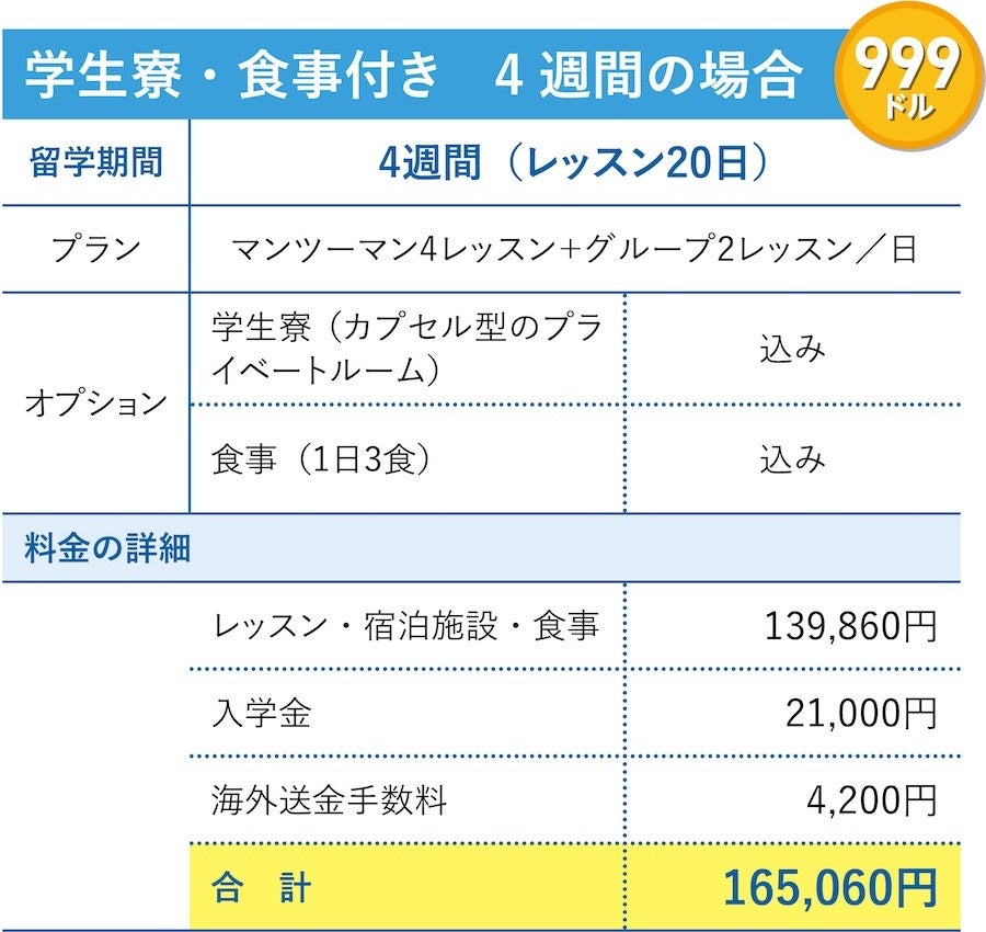 <学生寮・食事付き4週間 999ドルプランの場合>