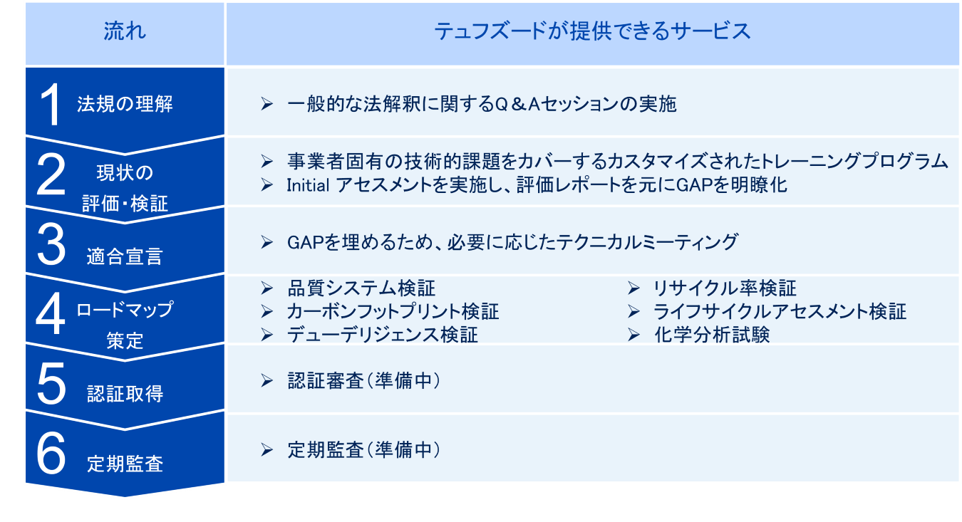 このたびテュフズードジャパンは、国内の関連事業者に対し、欧州バッテリー規則への対応をサポートする各種サービスを提供開始しました。法規への理解を深めるためのQ&Aセッション、現状の課題に対するトレーニング、評価(アセスメント)、適合宣言に向けたテクニカルミーティング、そして各種検証(品質システム、カーボンフットプリント、ライフサイクルアセスメント、デューデリジェンス、化学分析試験)など、幅広いサービスを提供します(図)。