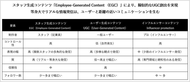 昨今のソーシャルメディアの急速な普及に伴い、ブランドと顧客の接点は多様化しています。かつてはリアルな店舗での接触が主流でしたが、現在ではWebやSNSといったオンライン空間へと広がり、顧客とのコミュニケーションがスピーディに行えるようになっています。さらにアパレル業界を中心に、ブランドの公式アカウントに加えて、店舗のスタッフ自身がSNSアカウントを活用する事例が急増しています。スタッフが自身のアカウントを通じて発信するコンテンツ情報は、「EGC(Employee-Generated Content,従業員生成コンテンツ)」と呼ばれ、「UGC(User-Generated Content,ユーザー生成コンテンツ)」と比較して、商品やサービスへの購入意欲を高めるための効果的な施策として注目されています。