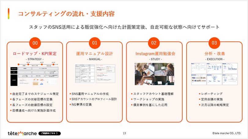 今回新たに提供を開始する「Instagramスタッフアカウント自走化支援サービス」は、SNSマーケティングのプロが、複数のスタッフアカウントを一括で管理・分析して、ロードマップの策定や、スタッフを対象に勉強会を実施するなど、企業の課題に合わせて自走可能な状態へ向けて支援するサービスです。