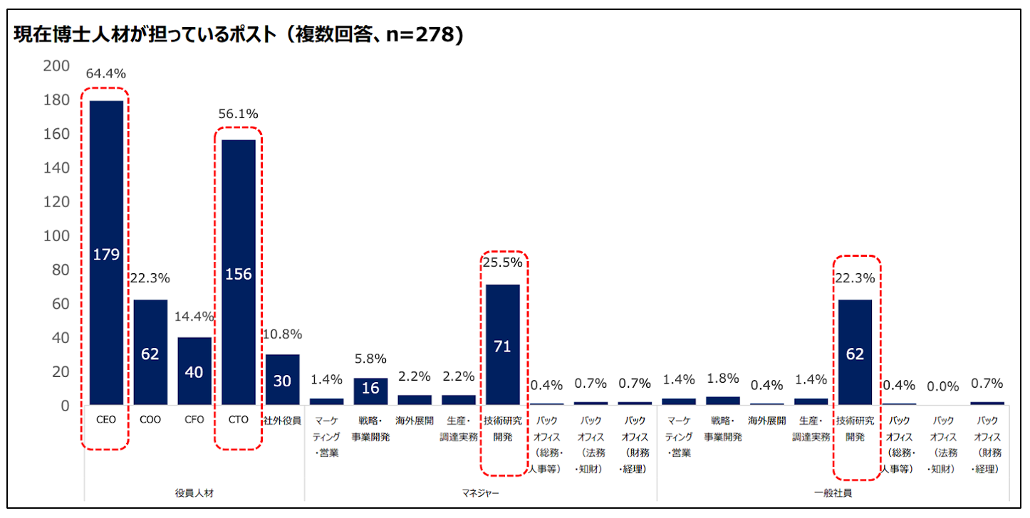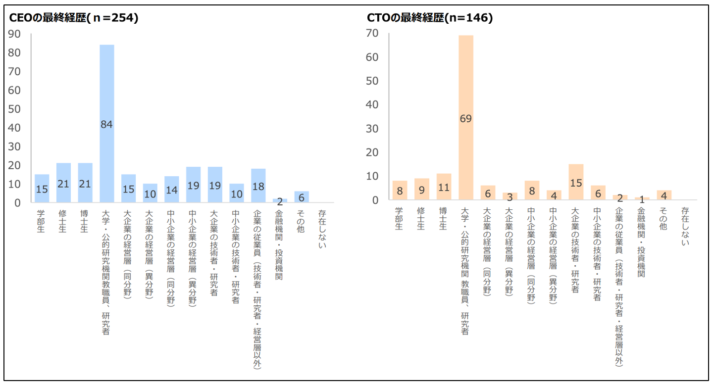 さらに、昨今では博士人材の起業や大学ベンチャーでの活躍に注目が集まっています。大学発ベンチャーは増加傾向にあり、2022年度調査(※5)では2021年度から477社増加し3,782社と、過去最高を記録しました。これらのベンチャーにおいてCEO、CTOを担う人材には「大学・公的機関の教職員、研究者」が最も多く、一般企業研究職より博士人材を積極的に活用する傾向がうかがえます。