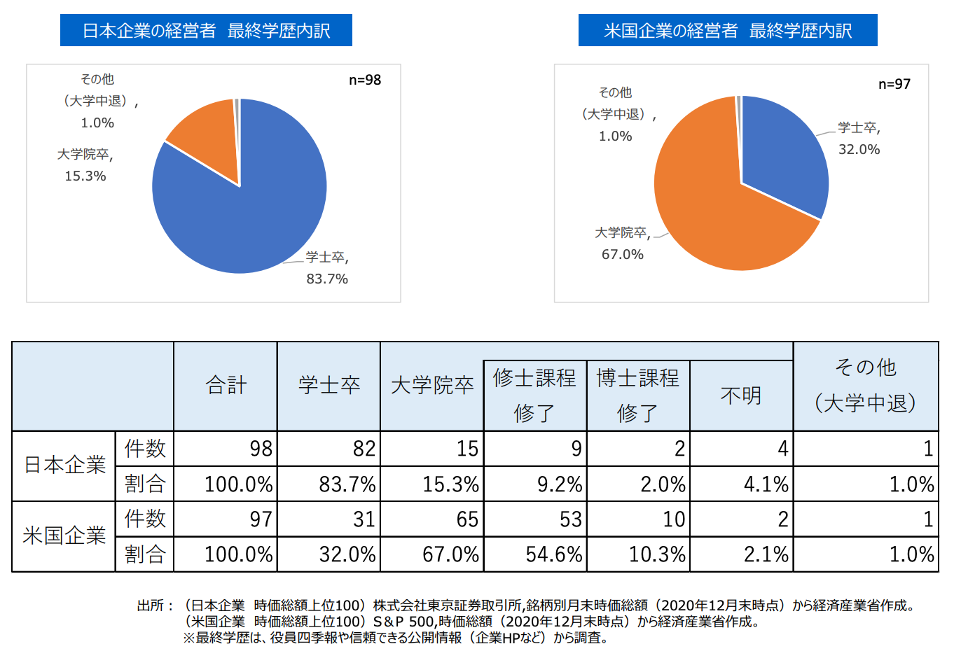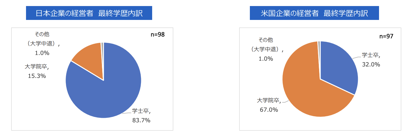 さらに、日本企業の経営者は8割以上が大学卒、米国では約7割が大学院卒と、経営者の最終学歴においても差が出ています。(※6)