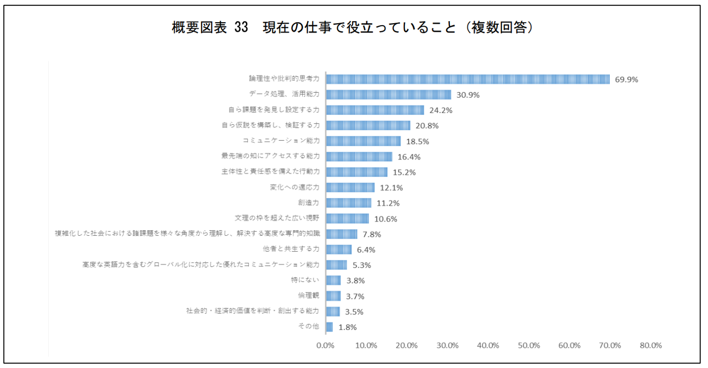 博士人材自身が、現在の仕事に役立っているスキルとして実感している、「論理性や批判的思考力」「自ら課題を発見し設定する力」「自ら仮説を構築し、検証する力」とも合致しており、博士人材の能力を的確に理解し活用している例だと言えます。(※9)これまでの自身の専門分野に限らず広い分野で課題設定・問題解決を行えるということは、言い換えれば、博士人材は専門分野を横断して新たなエキスパート分野を開拓できる素養を備えているということです。博士人材の持つこれらの高度な能力が評価されれば、企業での活躍の場は広がってゆくでしょう。