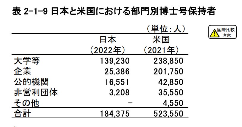 例えば、米国では大学で働く博士人材と企業で働く博士人材の数に大きな差はありません。日本と米国の博士号保持者についての条件が異なるため一概に比較はできませんが、日本において博士人材が籍を置く場は大学が圧倒的に多く、企業在籍者は大学の2割に及びません。(※6)