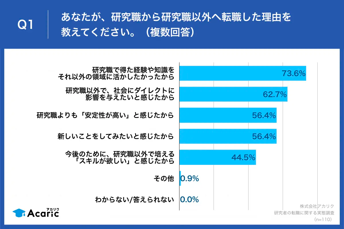 また、研究職以外のキャリアを求めて企業に就職する博士人材もいます。当社が研究者(研究職)から研究職以外へ転職した方を対象に実施したアンケート(※4)では、研究職以外への転職理由として「経験や知識を他の領域に活かしたかった」「研究職以外で、社会にダイレクトに影響を与えたいと感じたから」といった声が挙がりました。
