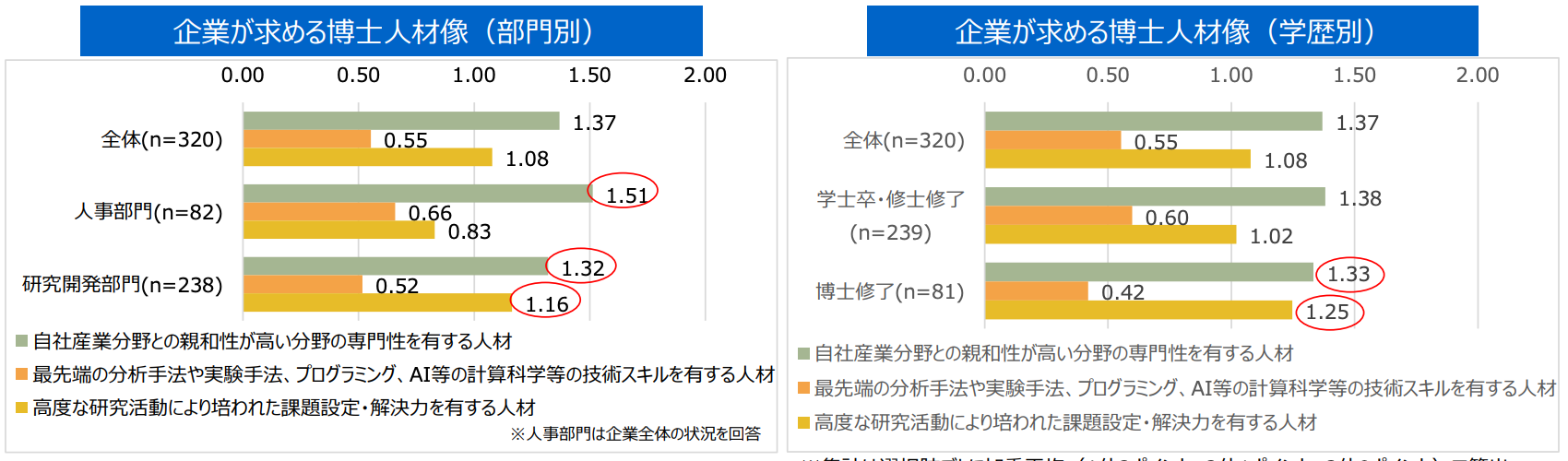 ただし、研究開発部門の者、または自身が博士修了者である者には、分野の専門性に加え、「高度な研究活動により培われた課題設定・解決力」にも同程度期待しています。これは、