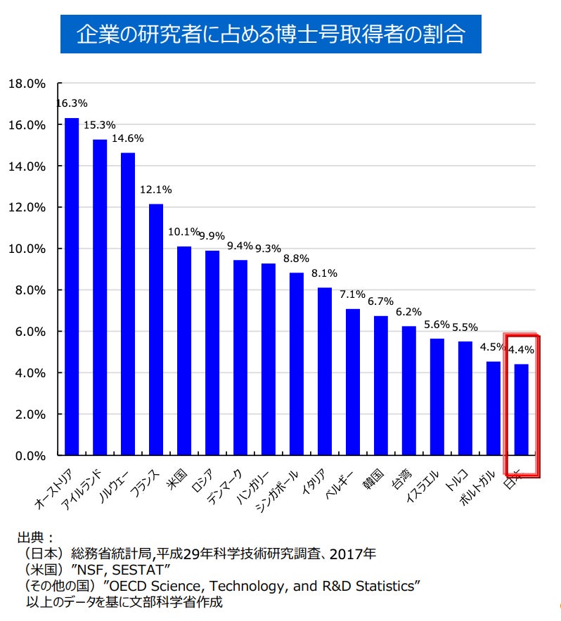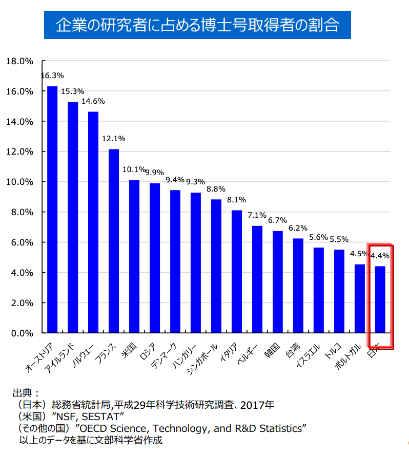また、世界的に見れば、日本企業の研究者に占める博士号取得者の割合は4.4%であり、この数はオーストラリアの1/4と、非常に低い状況と言えます。(※7)