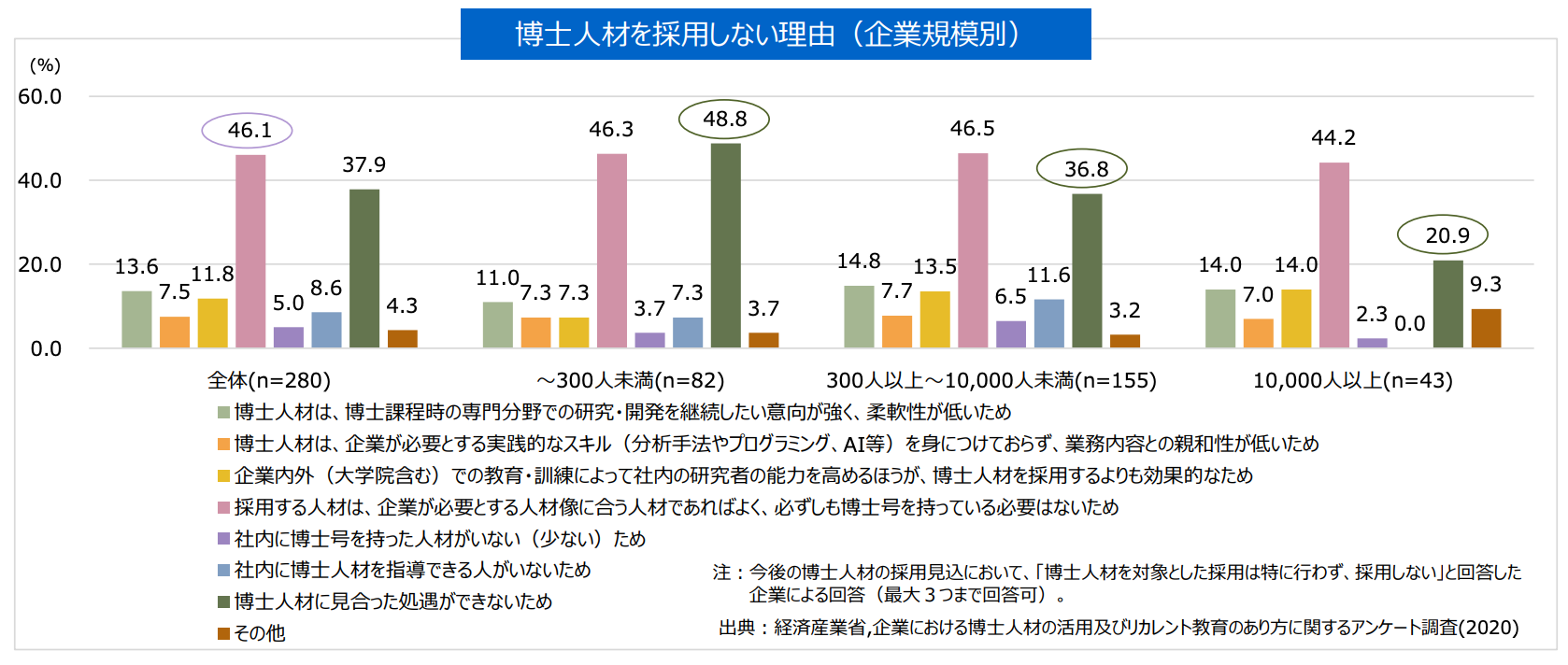 そのため、「研究者」や「専門家」、「大学院卒」と聞くと、「扱いにくそう」というマイナスなイメージが定着してしまっているのです。経済産業省の調査(※8)によれば、博士人材を採用しない理由として「企業が必要とする人材像に合う人材であれば採用に値し、必ずしも博士号を持っている必要はない」という意見が企業規模に関わらず高い割合を占めました。また、企業規模が小さくなるほど、「博士人材に見合った処遇ができないため」という理由も大きくなっています。