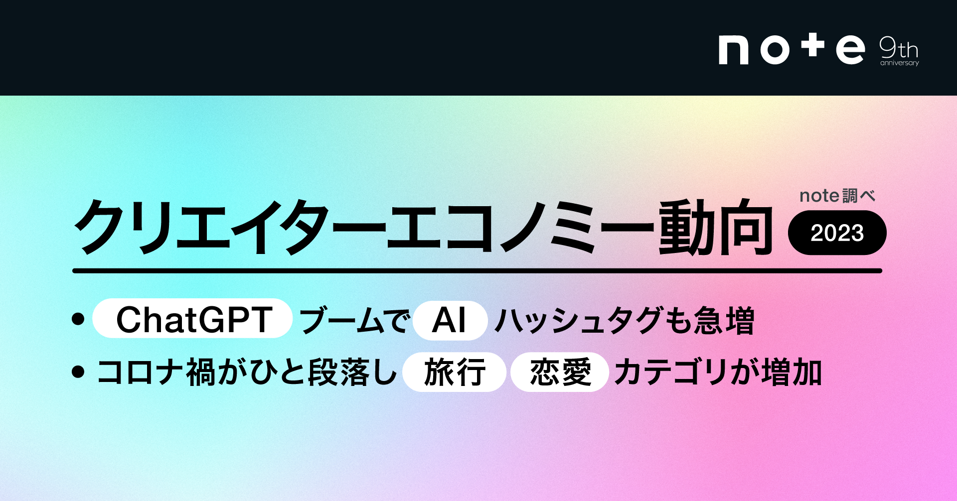 この1年を振り返ると、コロナ禍がひと段落し、旅行や恋愛などリアルを楽しむ傾向が創作にも表れていました。また、自分の好きなことを深堀りして収益を得るクリエイターが増え、創作へのAI活用の兆しが見えてきたことは、クリエイターエコノミーを応援するnoteとしても喜ばしく感じます。