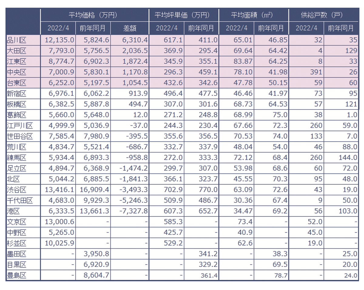 当社調べの2022年4月度東京23区別速報値分譲実績データです。