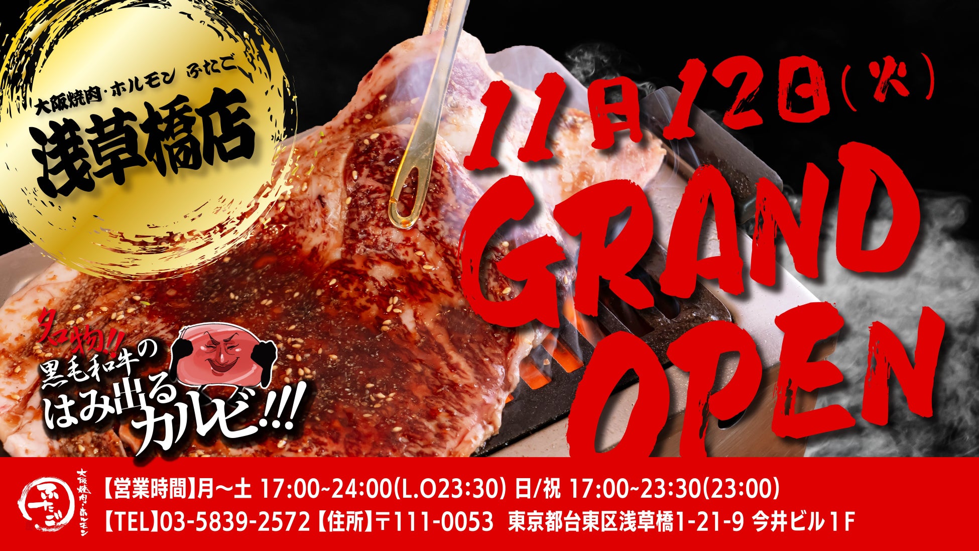 “名物!!黒毛和牛のはみ出るカルビ”で話題の「大阪焼肉・ホルモン ふたご」、11月12日(火)東京・浅草橋にグランドオープン!