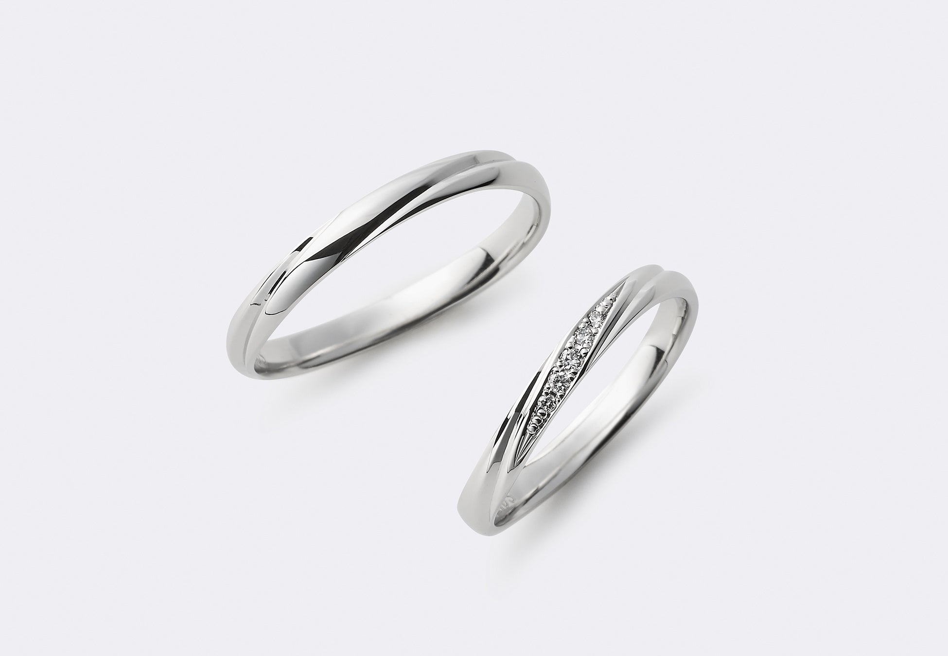 互い違いに入ったメレダイヤモンドの流れと溝のラインは、2本を重ねると繋がるかたちにデザインされています。