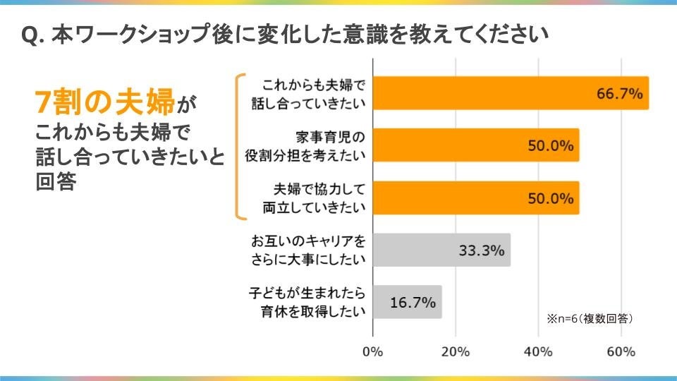 ワークショップ前の参加者には「そもそも話し合いの機会が持てていない」「夫婦間で家事育児の分担ができていない」の課題がありましたが、受講後のアンケートにて、約7割の参加者が「話し合いの重要性を理解できた」、また約半数が「夫婦で分担を見直し両立に向けて協力したい」と回答し、仕事と家事を両立しながら活躍するきっかけを提供することができました。