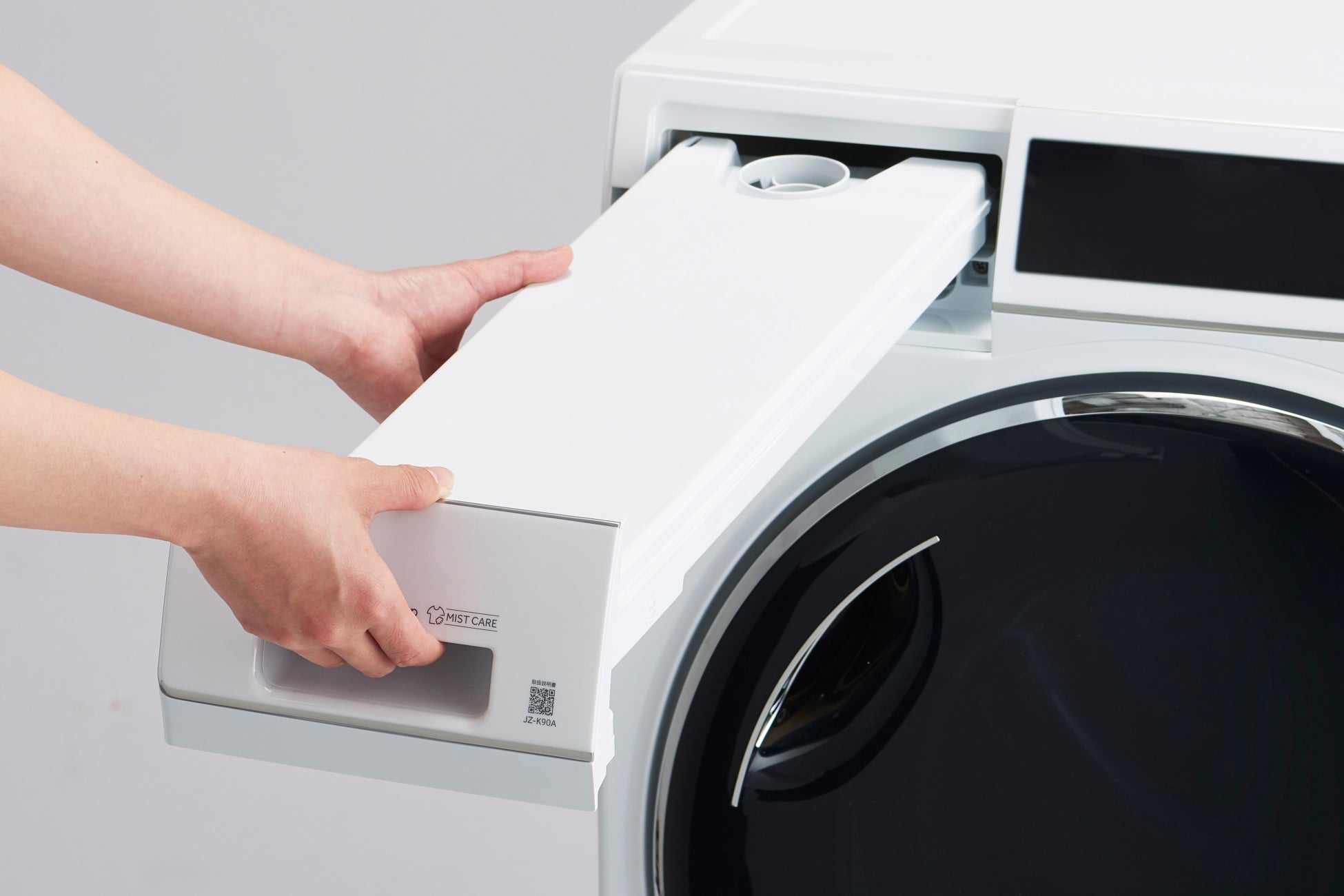 ヒートポンプ式衣類ケア乾燥機(JZ-K90A)「FUWATO」は、同時洗濯・乾燥スタイルに最適な製品です。ハイアール国内初展開の衣類乾燥機である本製品は、業界最大容量※1かつ低温で衣類を乾燥するヒートポンプ式。大量の洗濯物を一度に乾燥できるだけでなく、衣類を傷めず乾燥することが可能です。また、ミストケア機能を使った衣類ケアとしてもご使用いただけ、電源さえあれば排水口が無い場所でも設置が可能です。